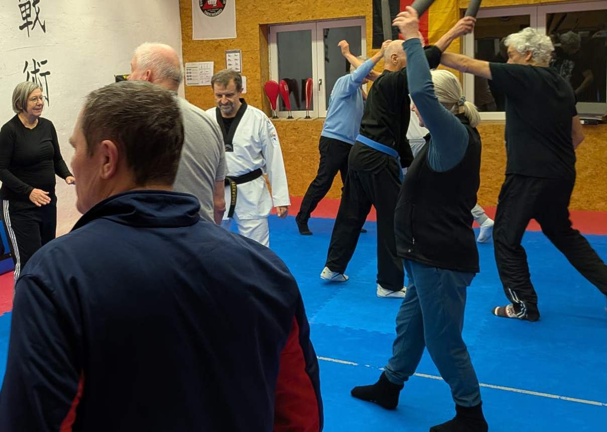 Mit Feuereifer dabei: Die Teilnehmer am Kurs Starke Senioren üben mit einem Schaumgummi-Stock das Abwehren eines Stockangriffs. In der Bildmitte Kursleiter Dr. Hans Jürgen Ott, links im Hintergrund Trainer Rainer Kotz.